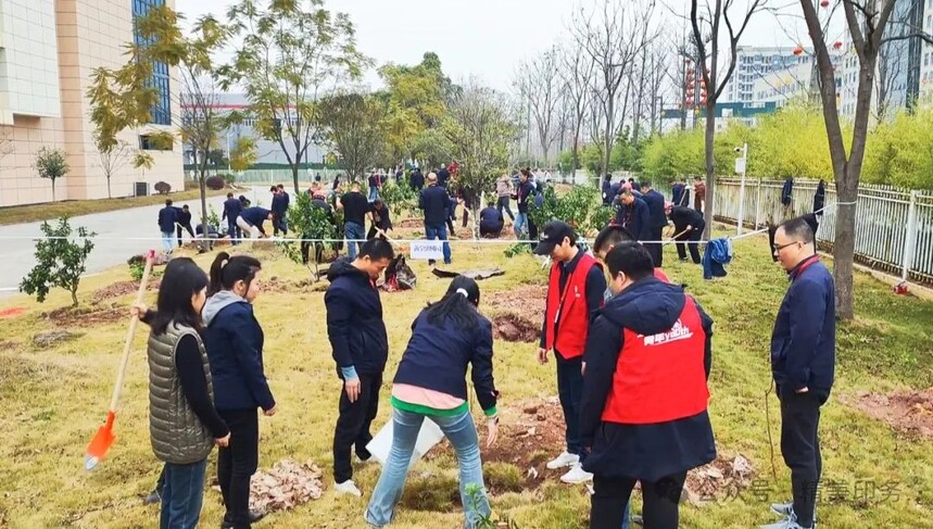 活动现场,员工们拿起铁锹、扛起锄头、抬起树苗,有序投入到搬石、松土、植株、回填、施肥、浇水等植绿环节。