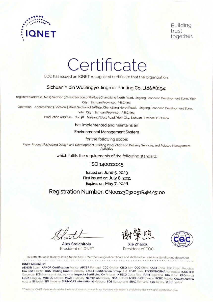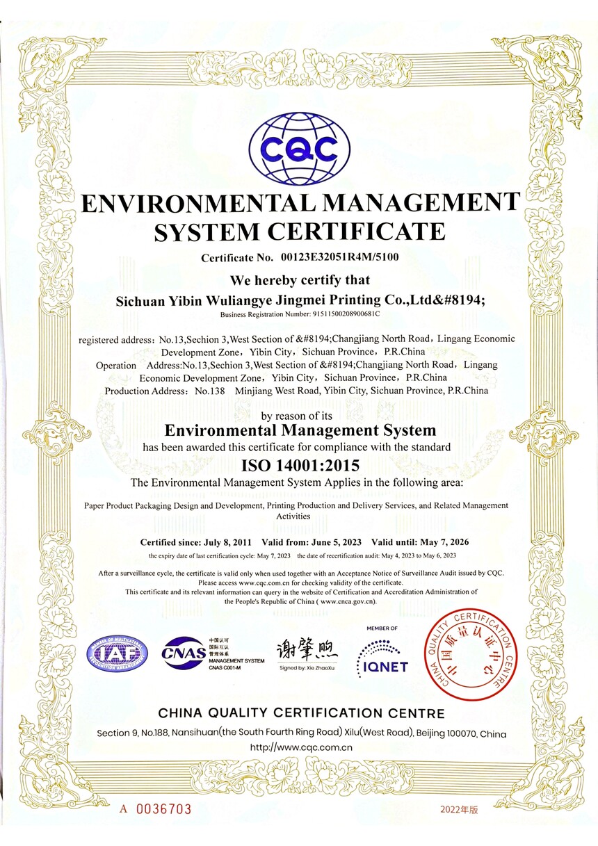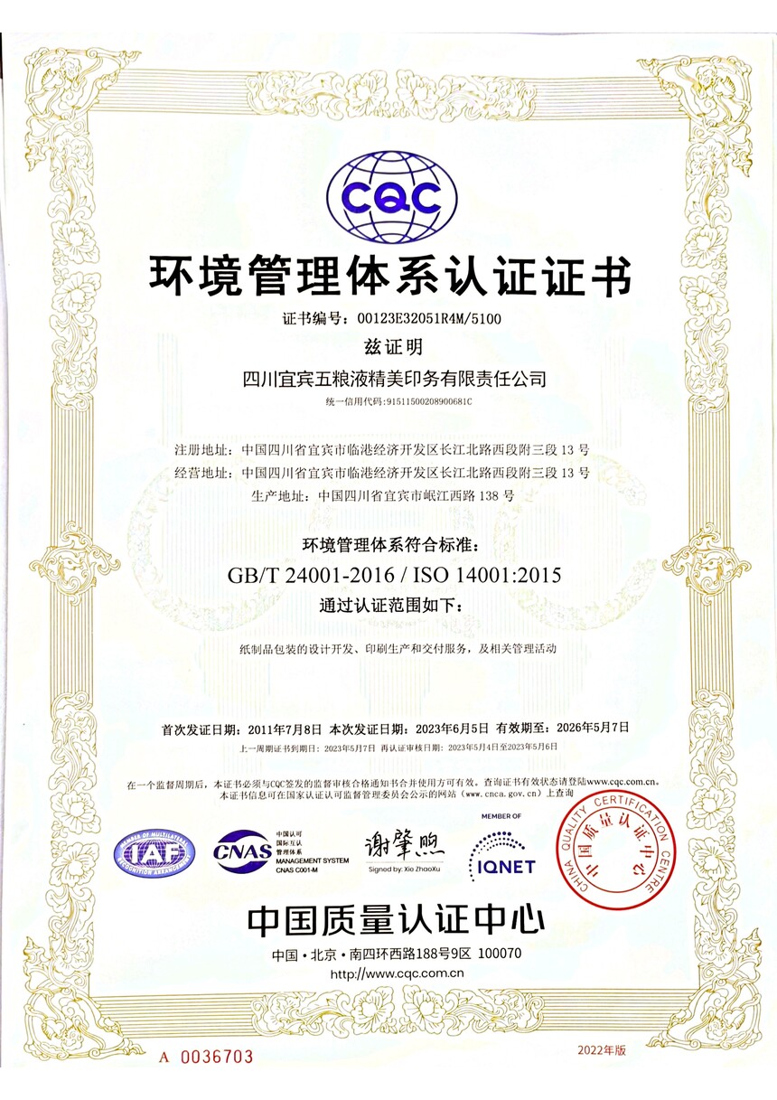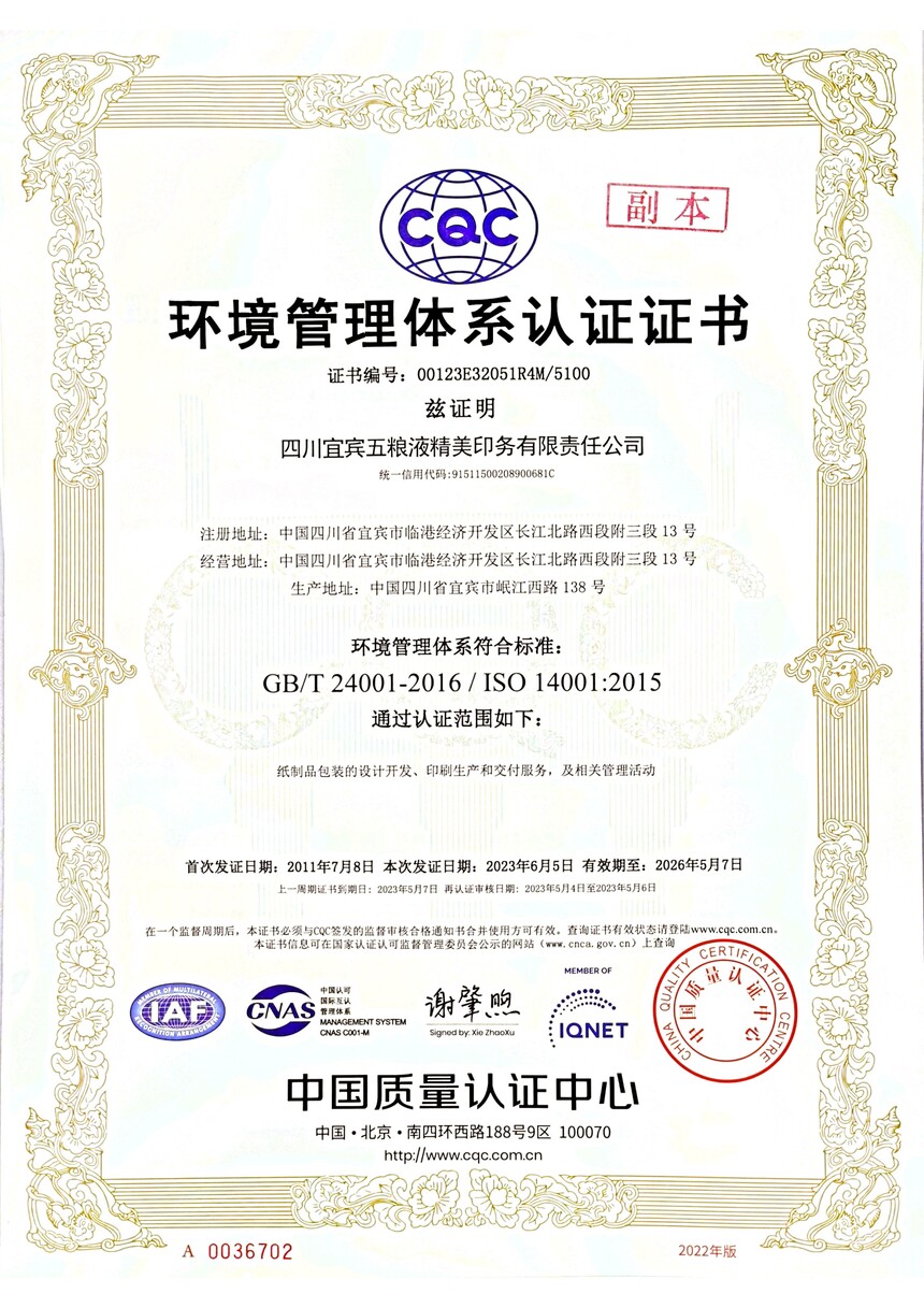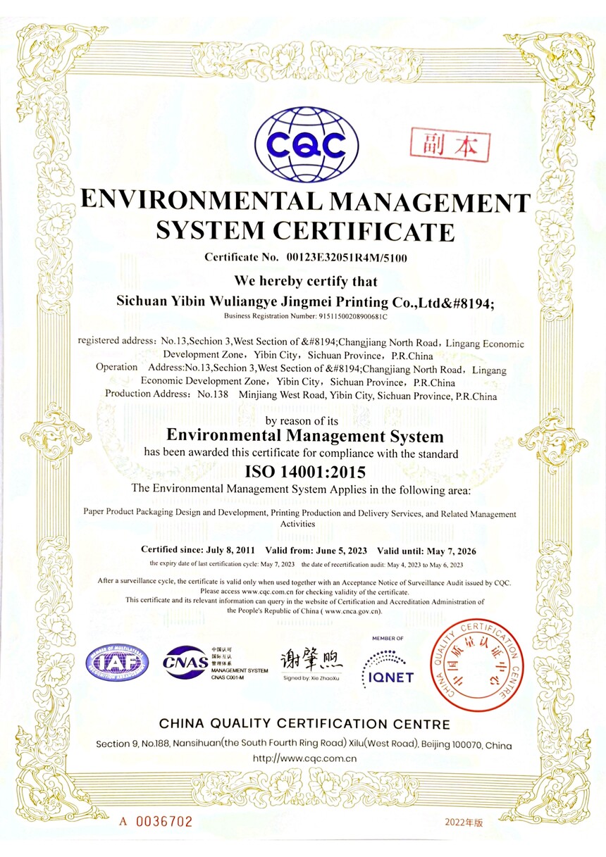 环境管理体系认证证书正副本中英版(2023.6.5-2026.5.7)