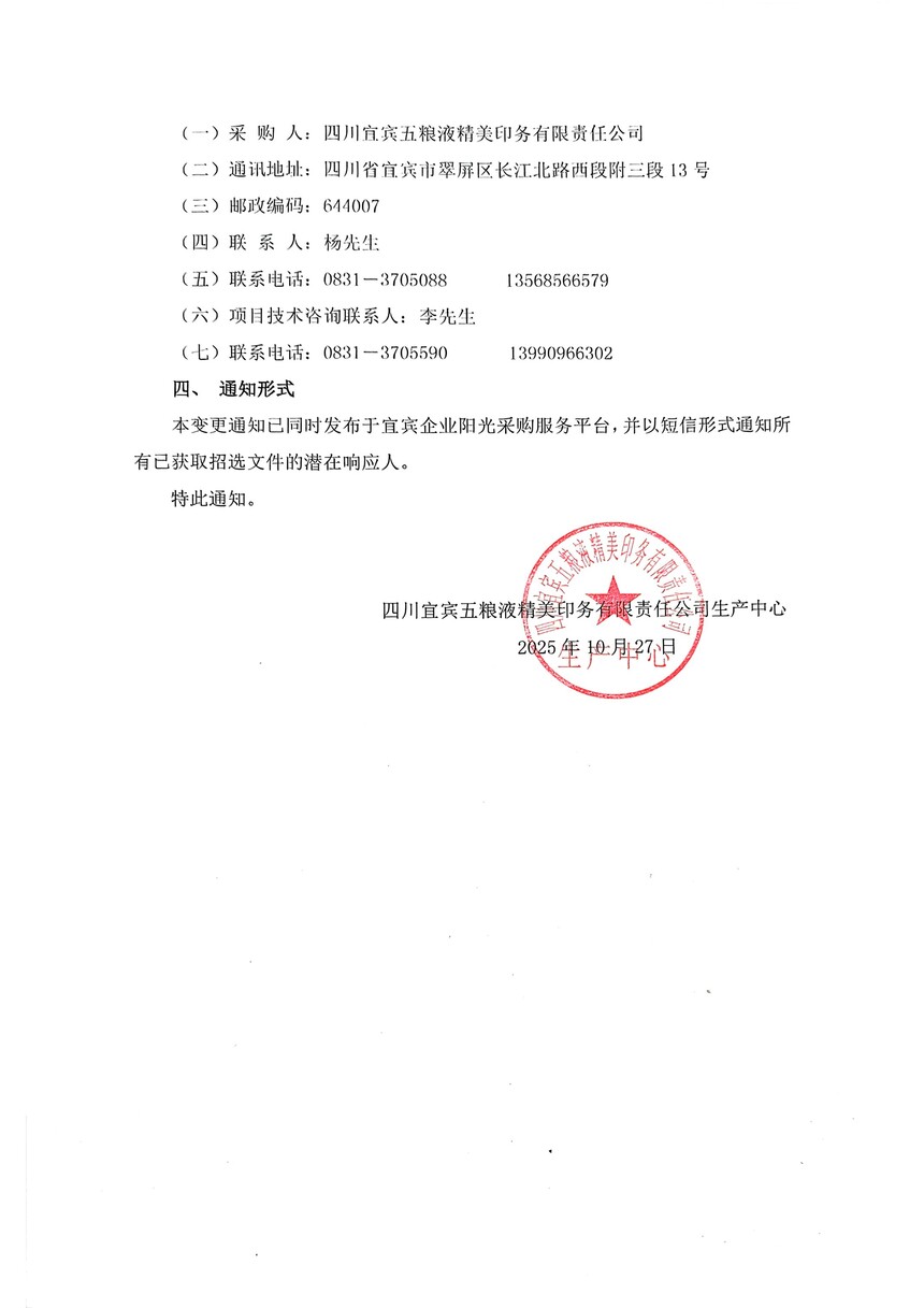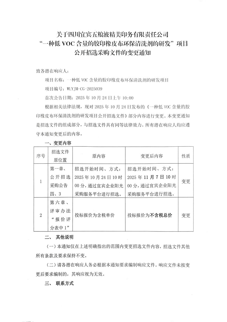 关于四川宜宾五粮液精美印务有限责任公司“一种低 VOC含量的胶印橡皮布环保清洗剂的研发”项目公开招选采购文件的变更通知