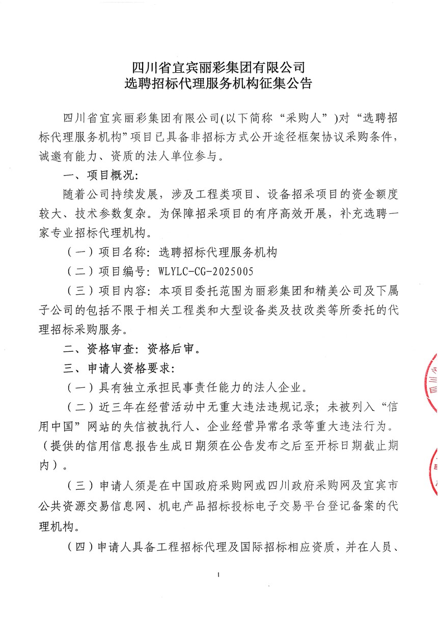 四川省宜宾丽彩集团有限公司选聘招标代理服务机构征集公告