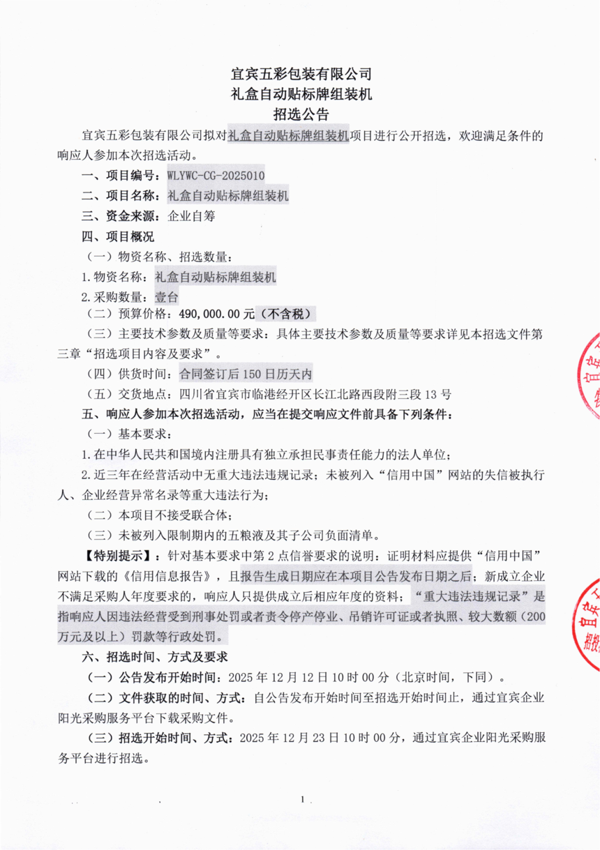 宜宾五彩包装有限公司礼盒自动贴标牌组装机招选公告