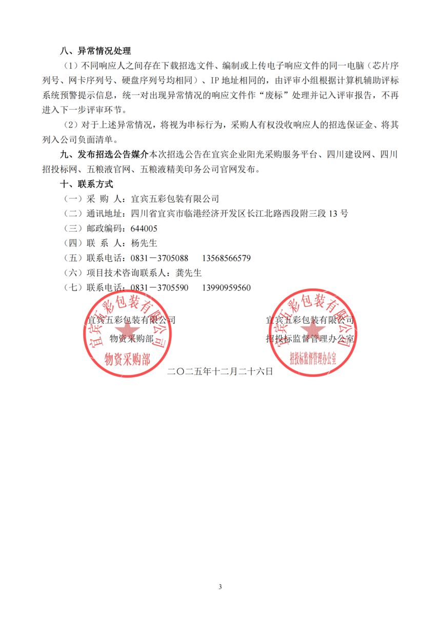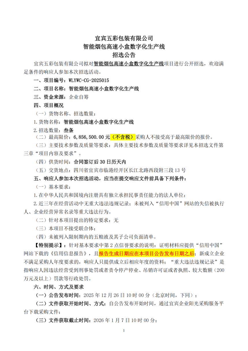 宜宾五彩包装有限公司 智能烟包高速小盒数字化生产线 招选公告