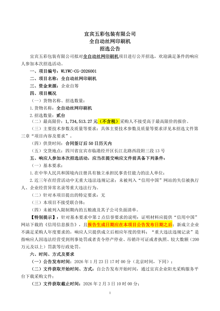 “全自动丝网印刷机”公开招选公告