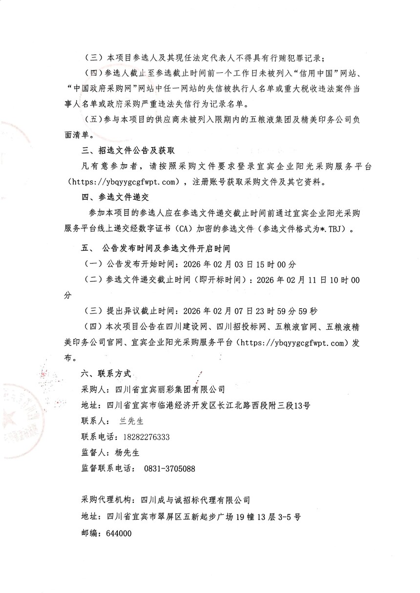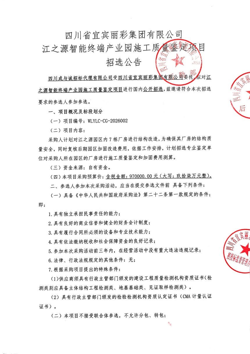 四川省宜宾丽彩集团有限公司江之源智能终端产业园施工质量鉴定项目招选公告