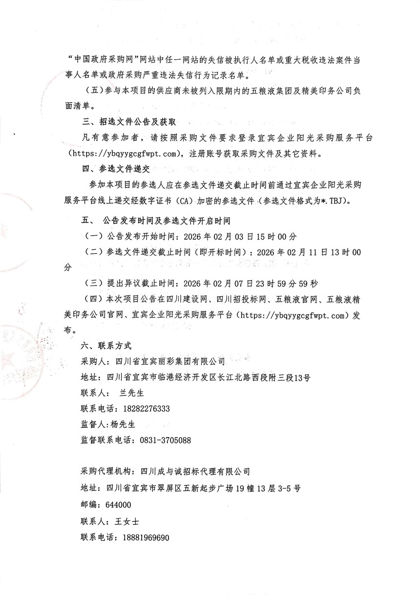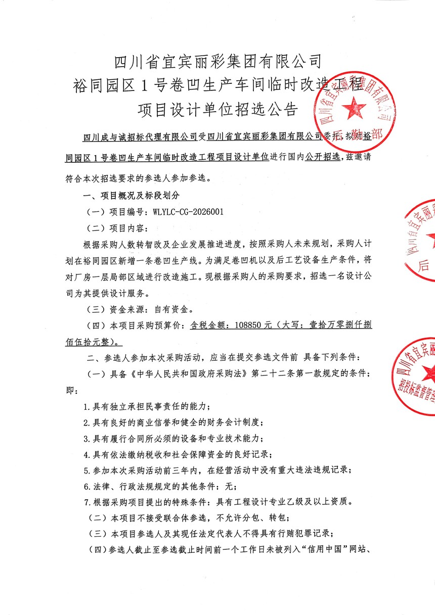四川省宜宾丽彩集团有限公司裕同园区1号卷凹生产车间临时改造工程项目设计单位招选公告