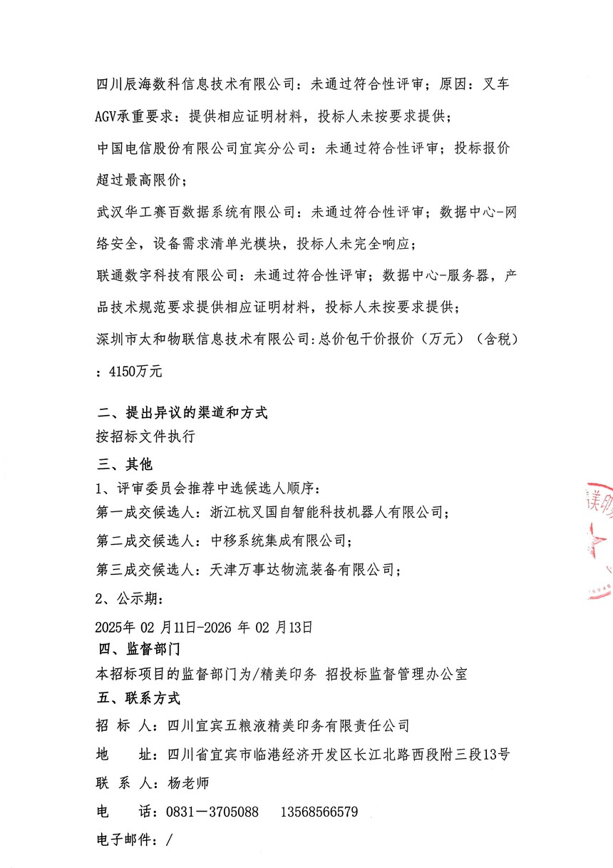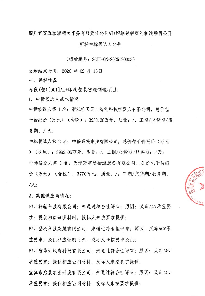 四川宜宾五粮液精美印务有限责任公司AI+印刷包装智能制造项目公开招标中标候选人公告