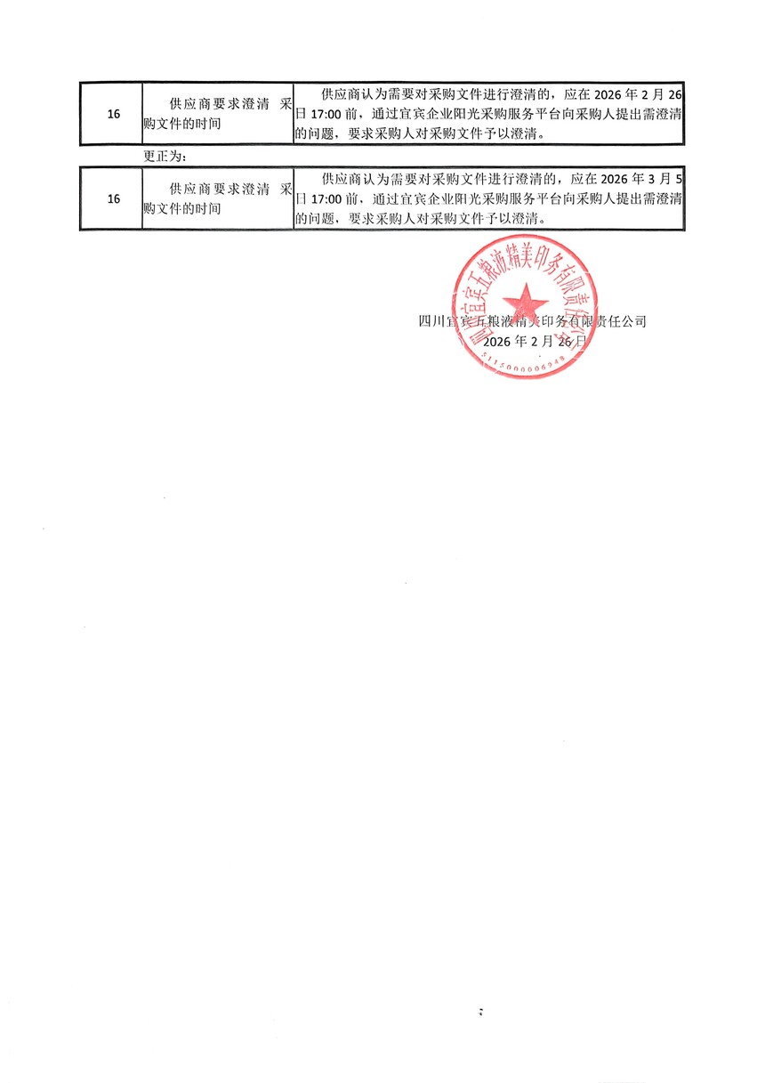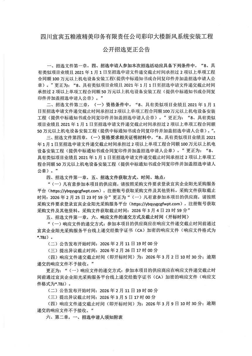 四川宜宾五粮液精美印务有限责任公司彩印大楼新风系统安装工程项公开招选更正公告