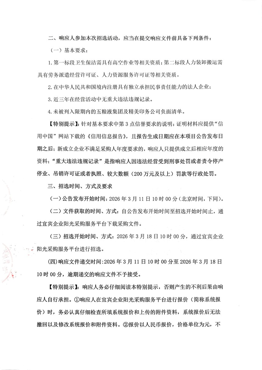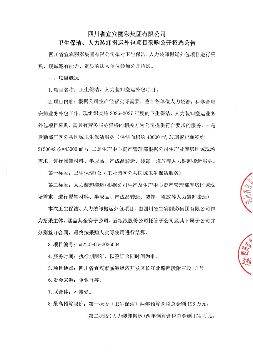 四川省宜宾丽彩集团有限公司卫生保洁、人力装卸搬运外包项目采购公开招选公告