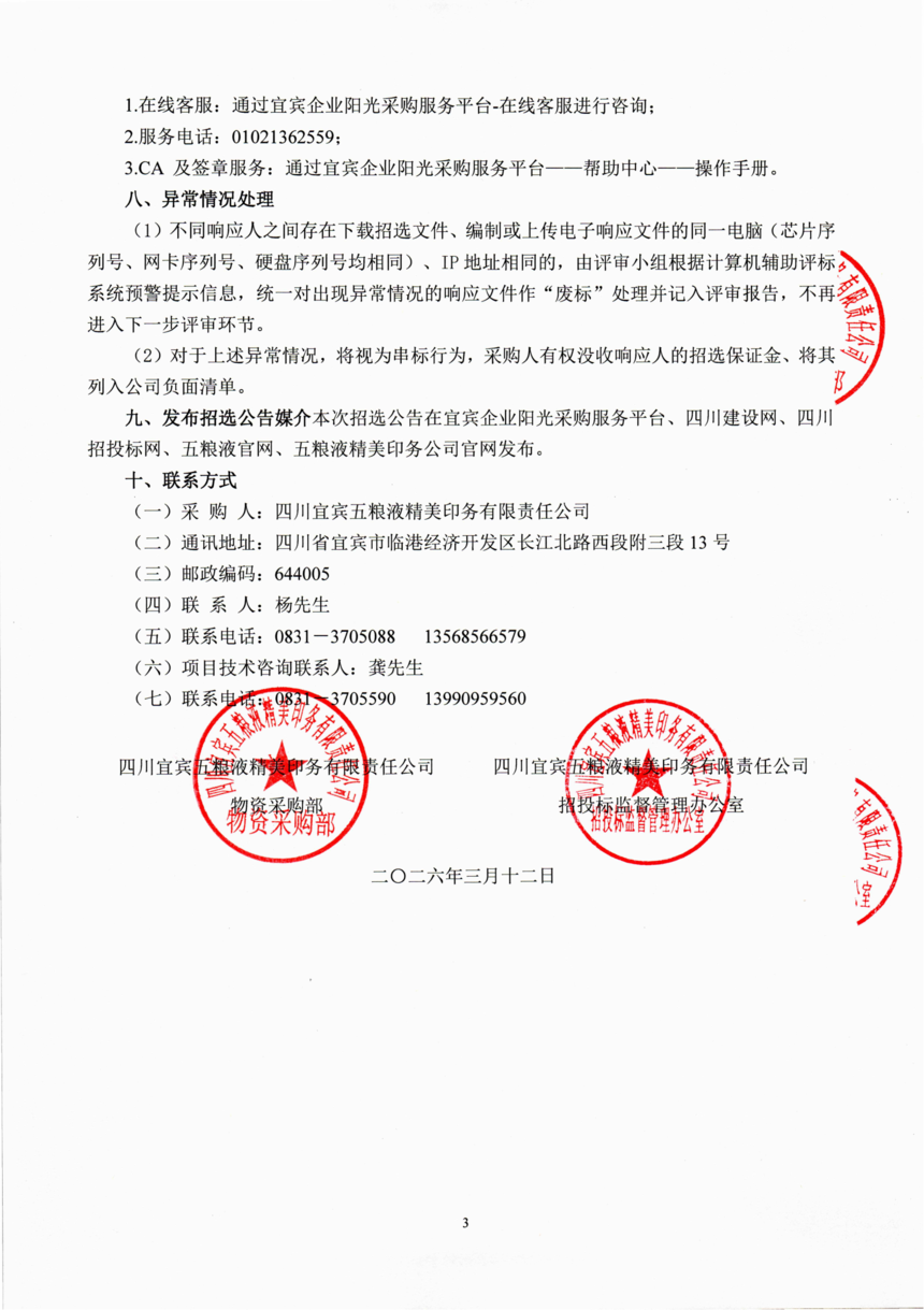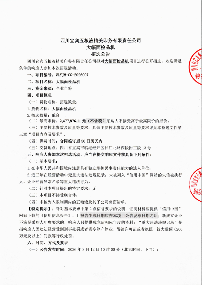 四川宜宾五粮液精美印务有限责任公司大幅面检品机招选公告
