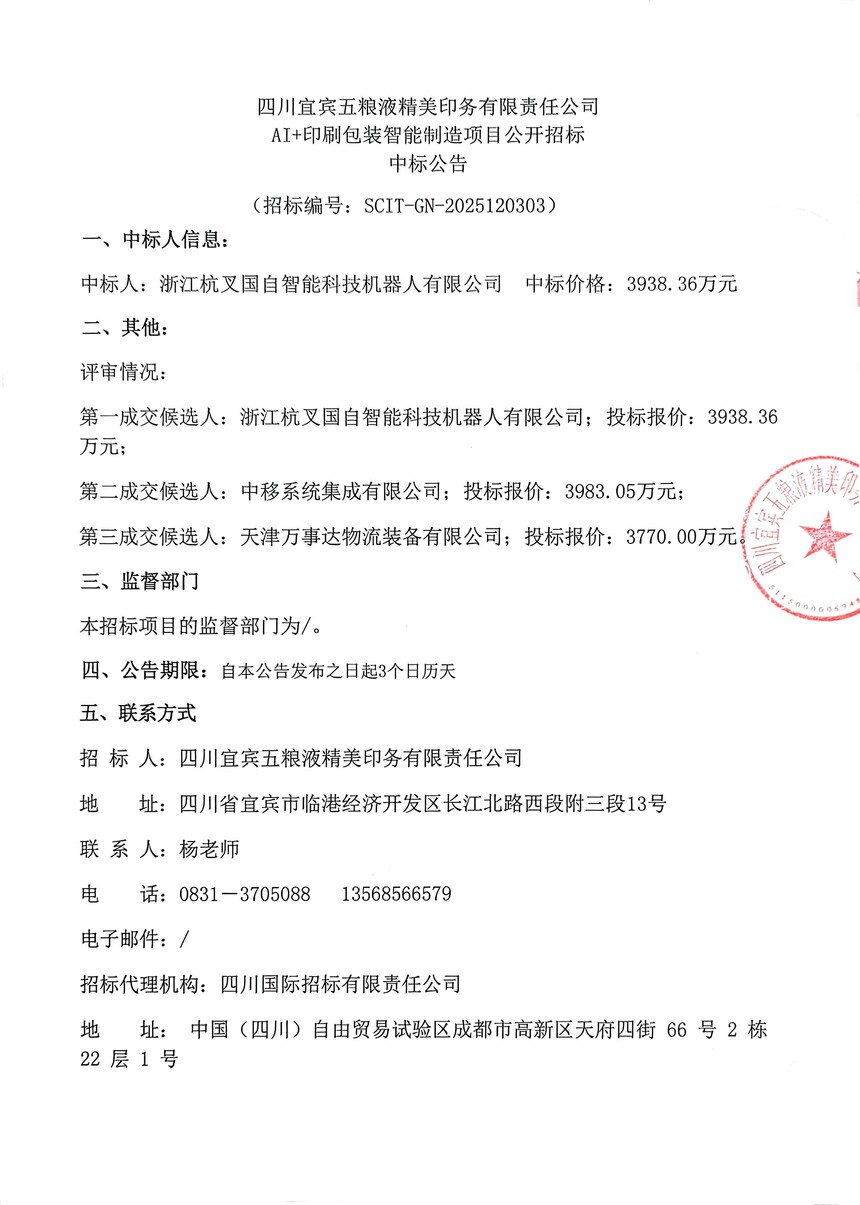 四川宜宾五粮液精美印务有限责任公司 AI+印刷包装智能制造项目公开招标 中标公告